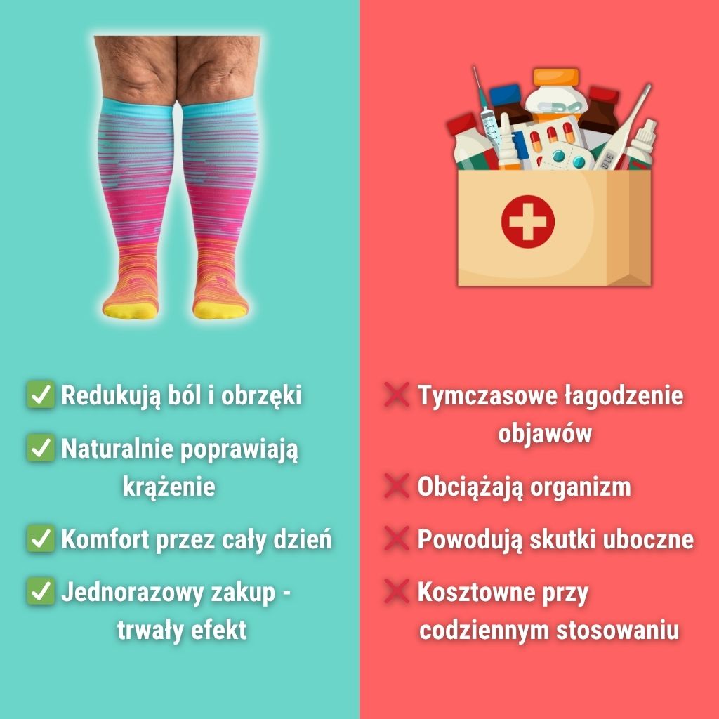 Tradycyjne skarpety — nawet „dla diabetyków” czy seniorów — często uciskają i zostawiają ślady, co sprzyja drętwieniu, odciskom i narastaniu obrzęków oraz bólu. Typowe skarpety kompresyjne projektowane dla sportowców są sztywne, trudne do założenia na większą łydkę, a ich ucisk szybko staje się nie do zniesienia.